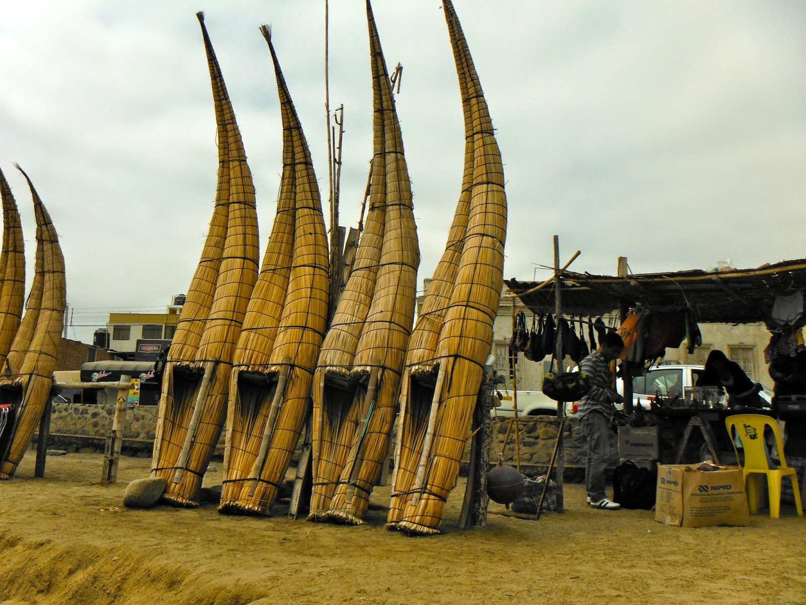These are caballitos de totora which are reed watercrafts used by Peruvian fishermen for the past 3,000 years. Named for the way they are ridden, straddled ('little reed horses' in English), fishermen use them to transport their nets and collect fish in their inner cavity. The name is not the original name as horses were not introduced to South American until after the Spanish arrived in the 15th Century. They are made from the same reed, Scirpus californicus, used by the Uros in the Lake Titicaca region.